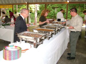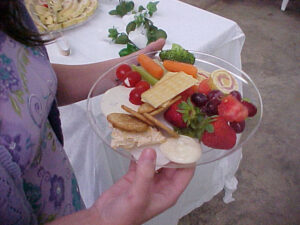 We use a buffet-style serving method where your guests quickly serve themselves. We serve drink refills and may assist in serving certain items. The use of serving pieces, plates, utensils, napkins, etc. is included in the price. Our buffets are served on decorated tables with polished stainless steel chafing dishes. Finger Foods and Hors d'oeuvres are served in stainless chafing dishes or silver or crystal trays depending on the items. Punch is served in an antique punch set with a silver ladle.