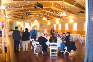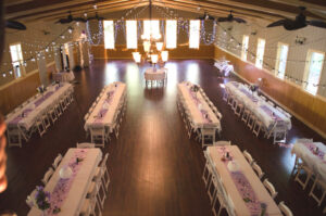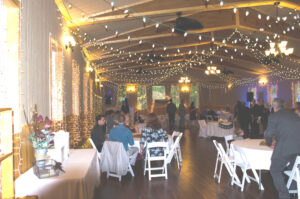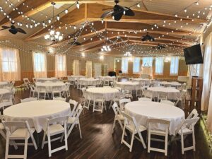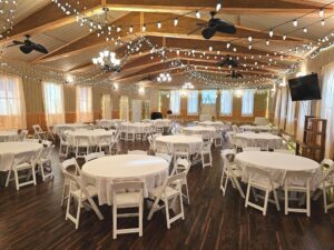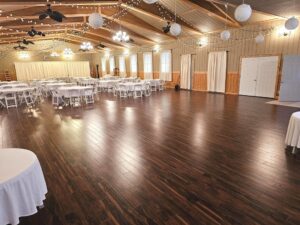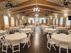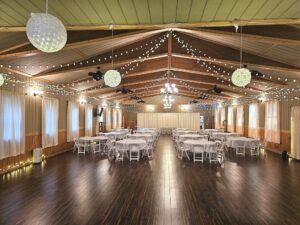 Spacious and beautiful! Our large ballroom seats 150 guests for lunch or dinner in the 5,000-square-foot reception hall. Set up one end of the building for either an indoor wedding or a reception with a wedding party table and a dance floor. At the other end, a buffet area resides behind white curtains. You will love the versatility. 13,000 LED lights create a magical effect for your event. Power is available for your music.